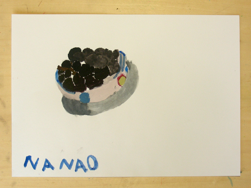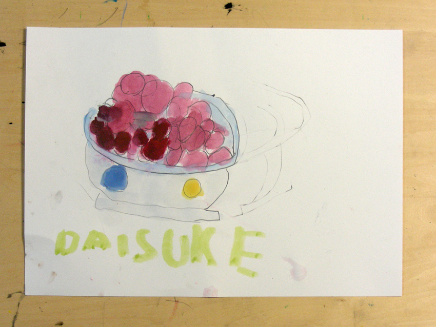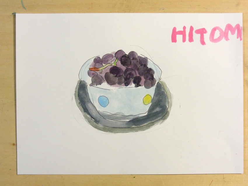 観察課題のモチーフを探していましたが、いいものをみつけました。ぶどうといえば紫か黄緑と思いがちですが実はそんなことはありません。今回選んだ「巨峰」はほんとうによく観察することでしか把握出来ない色をしています。もちろんそのまま塗ってちょうどいい絵の具があるわけもありません。これを子供たちはどう解釈し、どう立ち向かうかを見せてもらいました。